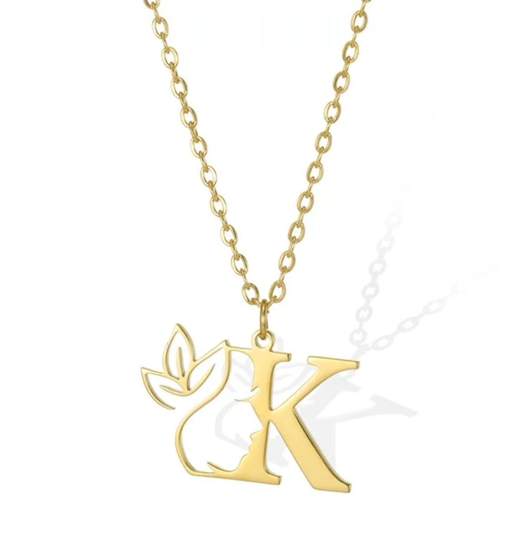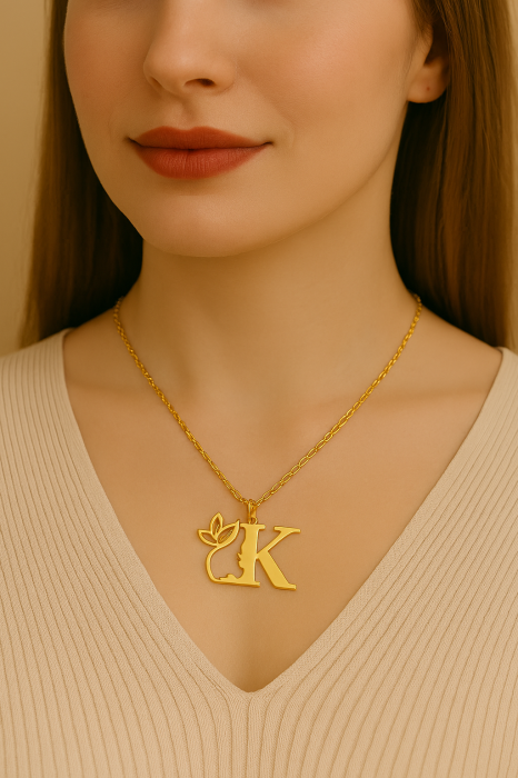 Lănțișor elegant din oțel inoxidabil placat cu aur de 18K, cu pandantiv în formă de inițială decorată cu siluetă feminină și detalii botanice. Rezistent la uzură, strălucire de durată și design modern. Un accesoriu personalizat, ideal pentru cadouri sau pentru a completa o ținută rafinată.