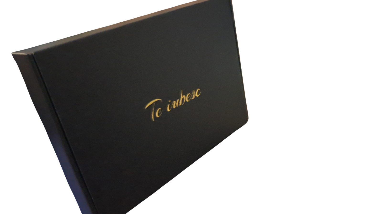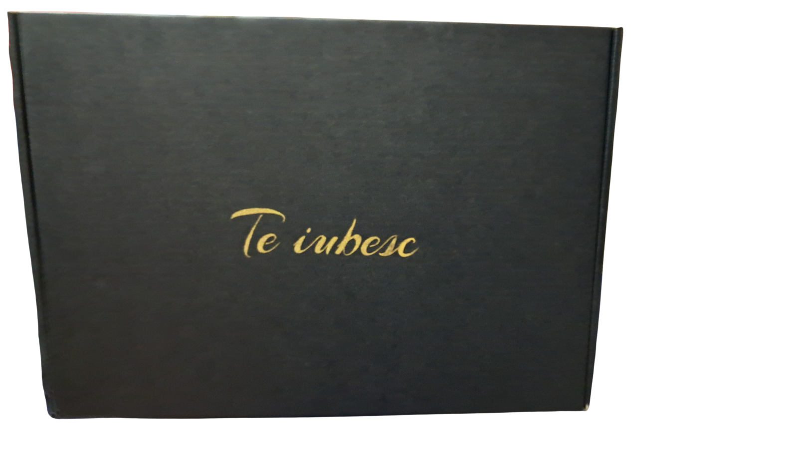 CUTIE ELEGANTA, NEAGRA , DREPTUNGHIULARA 33X25X5 CM CU MESAJUL ,,TE IUBESC '' PRINTAT CU AURIU, PE PARTEA FRONTALA .