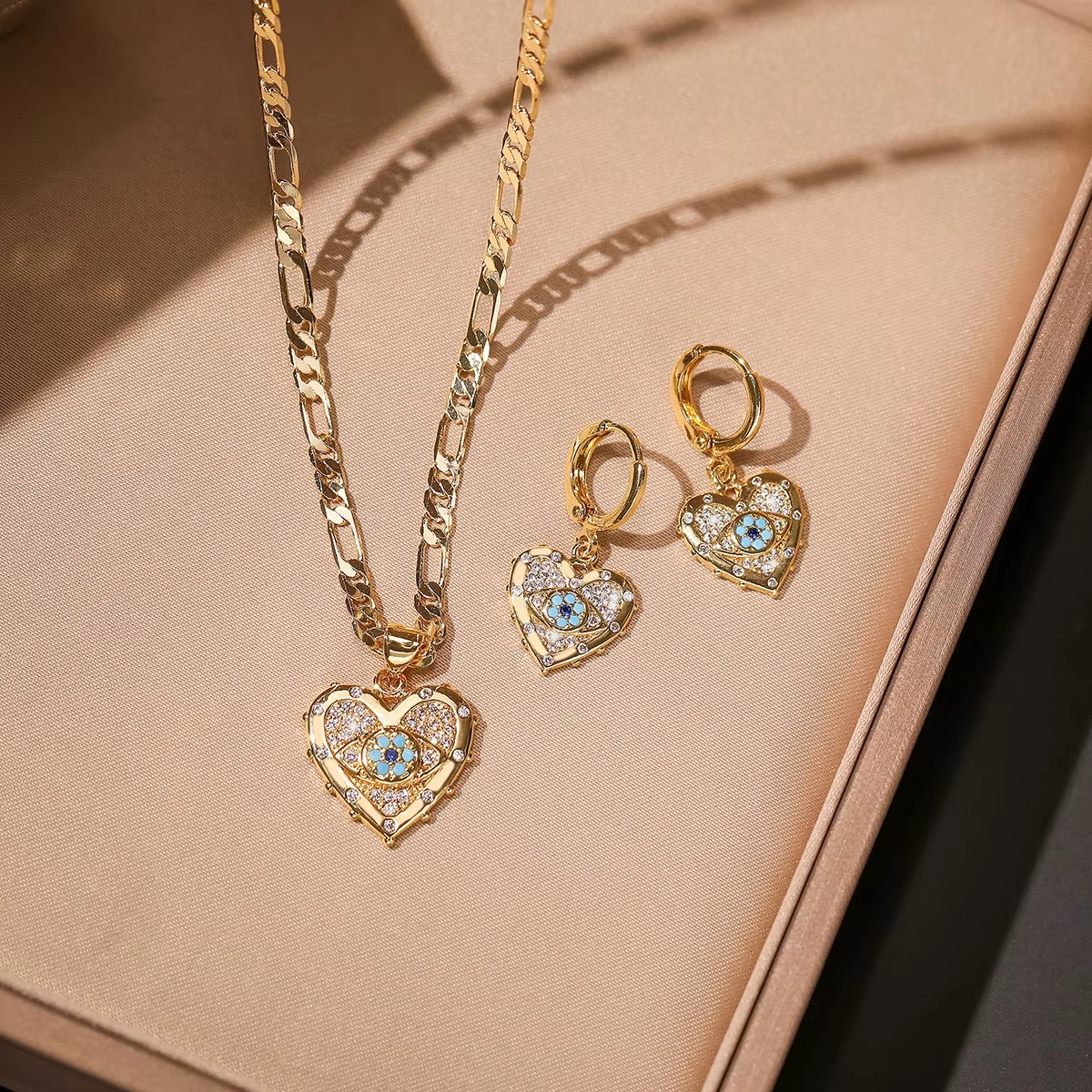 Lant dama cu pandantiv Evile eye in forma de inima, din cupru, placat cu aur de 18 k, si cercei inimioara cu evile eye.