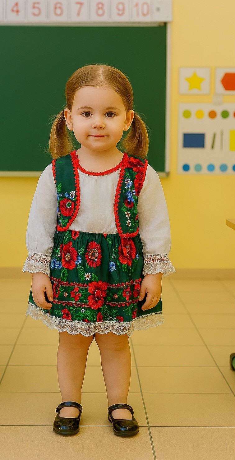 Costumul popular pentru fetiță este o piesă vibrantă și plină de farmec, ce reflectă bogăția tradițiilor românești și rafinamentul meșteșugului popular.