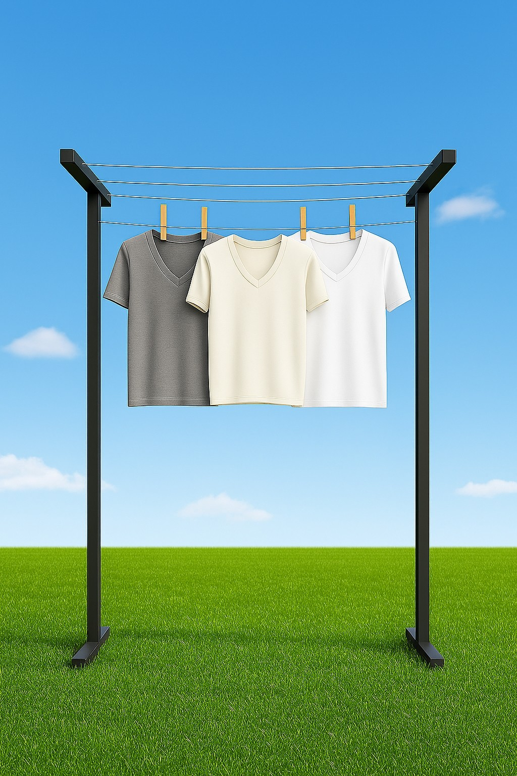 Design robust și minimalist: structura în formă de T oferă stabilitate și spațiu generos pentru întinderea rufelor.